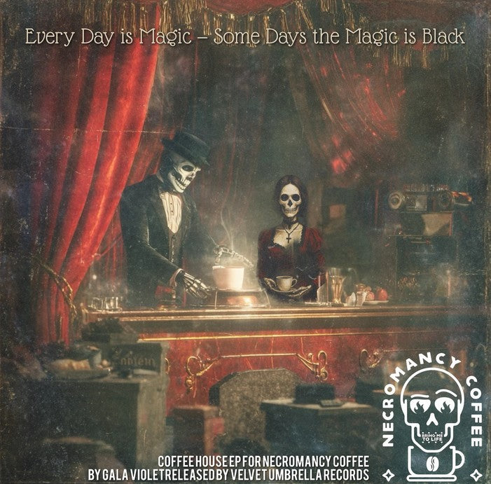 Necromancy Coffee House EP is more than a set of jingles, it’s a séance set to music. Gala Violet conjures cabaret mischief and spectral harmonies to celebrate the ritual of coffee as resurrection. Born out of late-night sessions at Studio TeaZilla and fueled by endless mugs of Necromancy Coffee, these tracks live somewhere between dark vaudeville and indie dreamscape.